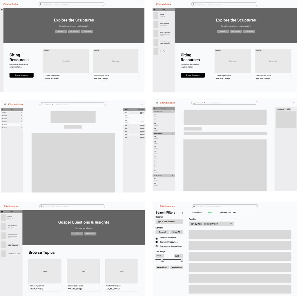 I started with low- to mid-fidelity wireframes to test layout and navigation changes based on insights from user interviews. The goal was to simplify the search flow, reduce cognitive load, and help users find relevant citations faster.
