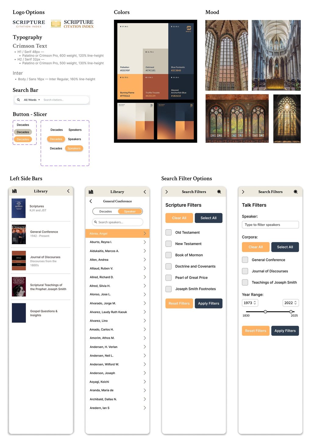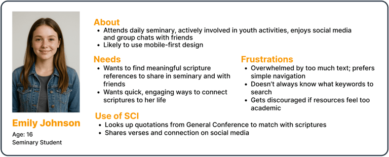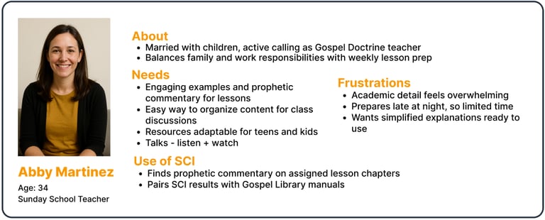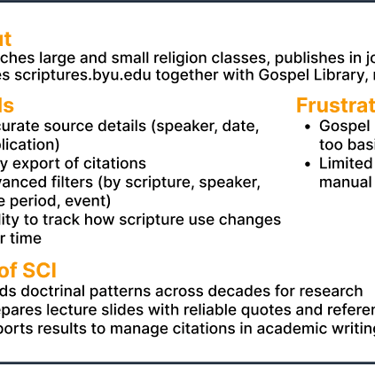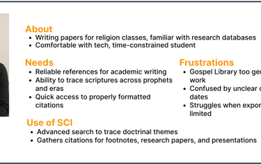 Based on insights from user interviews, I developed personas to represent the core user groups of the Scripture Citation Index. These personas helped align the redesign around real study workflows, ensuring the experience supported both quick lookup and deeper comparative study.