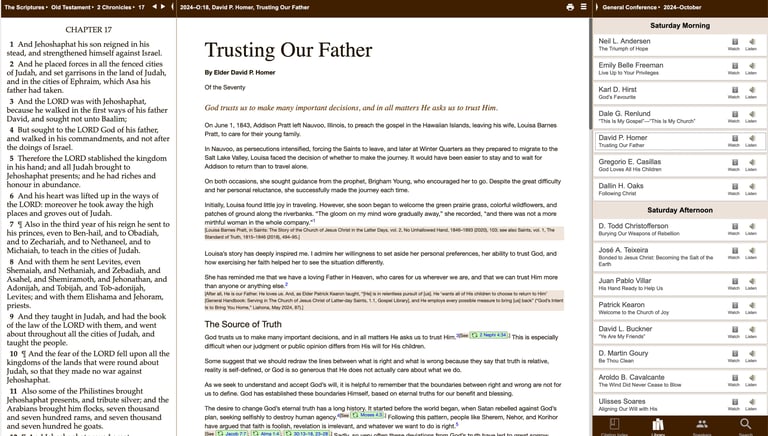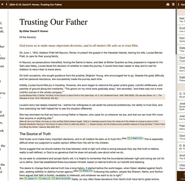Quickly find where a scripture is cited and understand its context across talks and teachings.