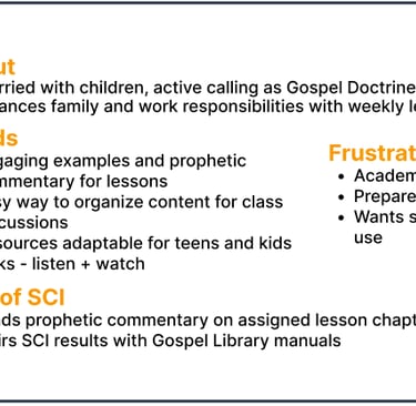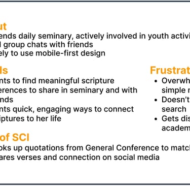 Conducted in-depth interviews with 5 indivisuals identify scripture study workflows and pain points in the previous app experience.